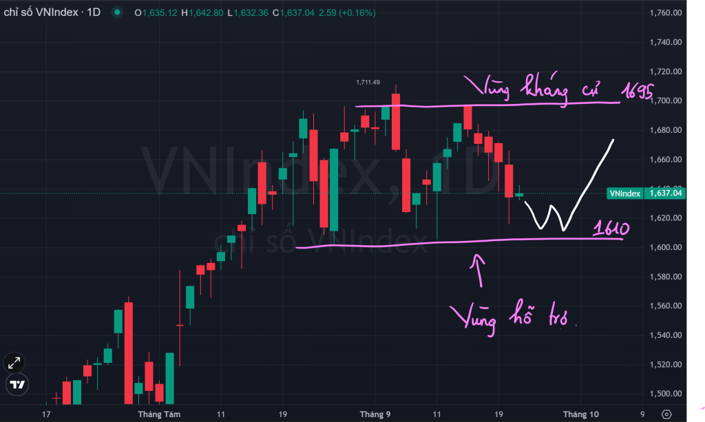 Rất nhiều nhà đầu tư mong chờ tin tức này vì tính tác động rất mạnh đến thị trường và vì thế nhiều nhà đầu tư cũng thận trọng với tin tức này cho nên em cho rằng thị trường sẽ tiếp biến động trong biên độ từ 1610 – 1695. Đây là chính vùng hỗ trợ và kháng cự gần nhất của VNIndex và thị trường sẽ giao dịch sideway xung quanh biên độ này.